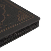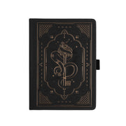 • Black Vegan Leather Cover – Embossed with a metallic serpent-and-key design.