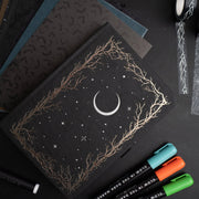 Haunted Hollow A5 Journal – Vegan leather cover stamped with a crescent moon + foil branches, 160gsm dot grid pages