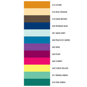 Ochre, Pale Orange, Dark Brown, Prussian Blue, Aqua Grey, Peacock Green, Wine, Plum, Cherry, Citrus Yellow, Spring Green and Pine Green
