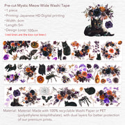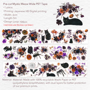 Bring a touch of mischief to your journal with the Pre-cut Mystic Meow Wide Washi/PET Tape. Featuring curious black cats, delicate spiders, and enchanting Halloween florals, each pre-cut design peels off like a sticker for instant spooky charm. Perfect for planner spreads, scrapbooks, or adding a little magical mischief to your notes.