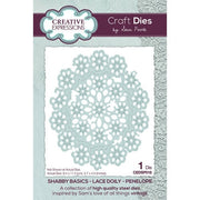This stand-alone Craft Die, Lace Doily, Penelope, is part of the Shabby Basics Collection designed by Sam Poole for Creative Expressions. This die features a lace doily that is well worn in places around the edge. This die is compatible with leading die cutting machines (sold separately). These dies can be used on cards, scrapbook pages, and other paper crafting projects. This die measures 3.68" x 3.68".