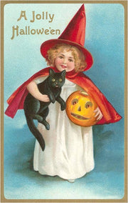 A Jolly Halloween, Little Girl Witch with Cat and Jack O'Lantern. This is a Postcard 3.5" x 5.5" featuring an image from our Halloween collection titled A Jolly Halloween, Little Girl Witch with Cat and Jack O'Lantern.