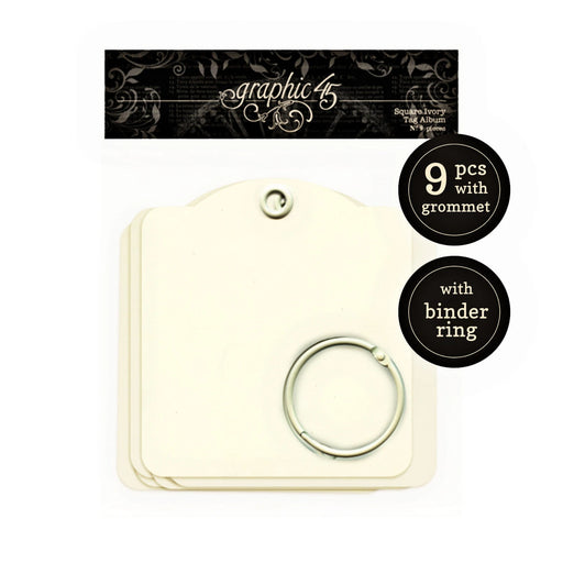 Graphic 45Square Tag Album, Ivory Nine tags feature a sturdy card with a grommet Including a matching binder ring Tag Measurements: 5 in x 4.5 in