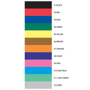 Black, Red, Blue, Green, Yellow, Brown, Orange, Violet, Pink, Lt. Blue, Lt. Green and Grey