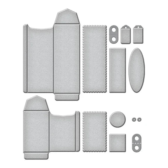 Mini Envelopes 1 Etched Dies are part of the Flea Market Finds Collection by Cathe Holden. It has a set of 13 thin cutting metal dies that create a long and short coin style envelope. Each size has a matching stationery insert to slide inside the envelope. Also, two different window shapes each to cut the fronts. There are three elements to use with both envelopes: tag, folded reinforcement holes and closure circles. The Long Envelope assembled measures 1.63 x 4.25 in./4.10 x 10.80 cm, and the Short Envelope assembled measures 1.63 x 1.56 in./4.10 x 4.00 cm.