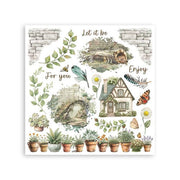 You’ll find hanging herbs, strings of lights, potted plants, open books, woodland animals (squirrels, foxes, hedgehogs, birds), keys, bottles, a watermill, a stone bridge, cottages, feathers, butterflies, logs, shells, brick textures, lanterns, teapots, cups, and more. These versatile motifs blend beautifully with the Herbarium Silvae collection and bring enchanting detail to journals, scrapbooks, cards, and mixed-media creations.