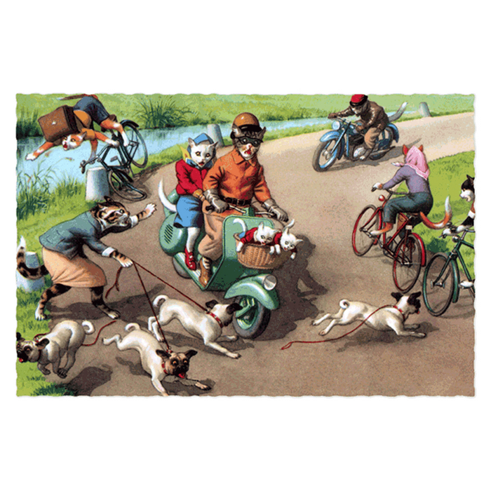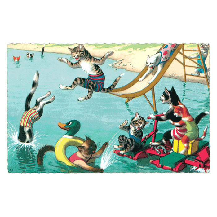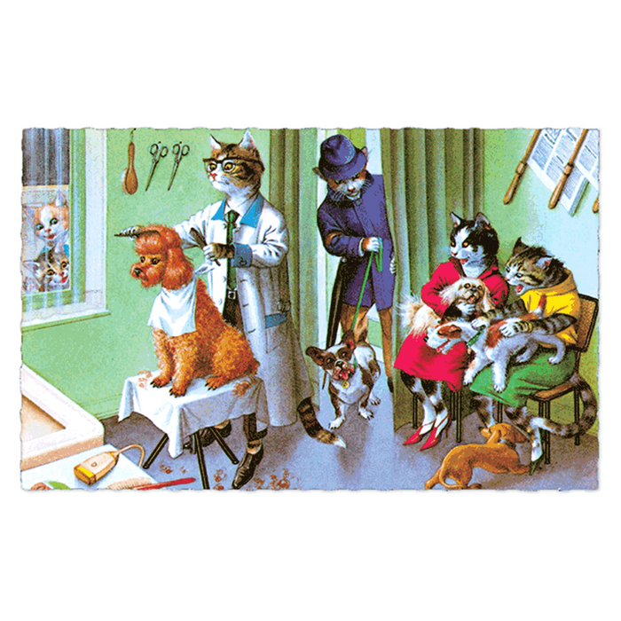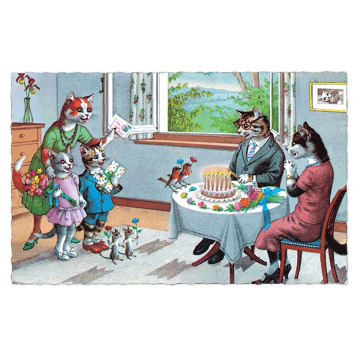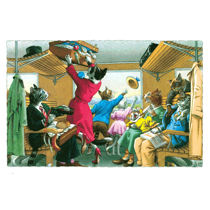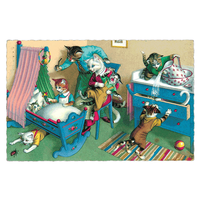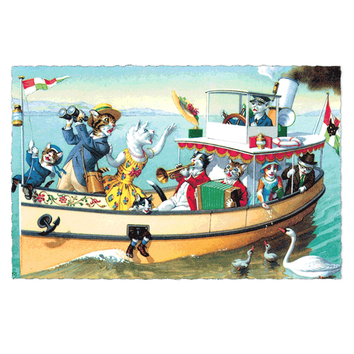 Beginning in the 1940s, illustrations of naturalistically painted cats were published as postcards, all by Swiss artist Eugen Hartung (1897-1973). He created more than two hundred designs. These cats mirror our human activities, and are both satirical and endearing.