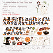 Get into the spirit of the season with the Pre-cut Ghostly Goodies Wide Washi/PET Tape. Featuring friendly little ghosts, charming Halloween accents, and a full set of themed alphabet and numbers, it’s the perfect way to add seasonal flair to your fall journaling and crafting.