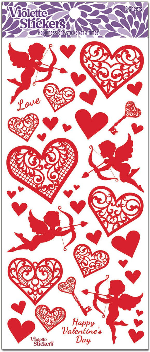 Violette StickersRed foil Valentine's Day stickers with lace hearts, keys, cupids with arrows and heart stickers of all sizes. 2 Sheets of 4" x 8" clear edge sticke...