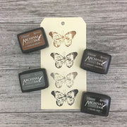 Tim Holtz Distress Mini Archival ink pads are waterproof, acid-free dye inks featuring the classic Distress color palette in the same fade-resistant formula used in Ranger Archival Ink. This kit includes four approximately 1.25 x 1.75-inch ink pads in the following colors: Hickory Smoke, Vintage Photo, Ground Espresso, and Black Soot.