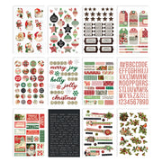 This 12 sheet sticker book is part of the Simple Vintage Dear Santa Collection from Simple Stories. This book has 336 stickers in total. There is a page of vintage Santas and candy canes, a page of ornaments, a page of metal labels and stars, a page of tags and border pieces, a page of circles with images from the collection, a page of words, a page of pieces of washi tape, a red and white alphabet with numbers and punctuation marks, a page of post office stickers, a page of white phrases on black paper, a page of layered pieces, and a page of holly leaves and berries, some with birds on them. These stickers can be used on cards, scrapbook pages, tags, journals, and other paper crafting projects.